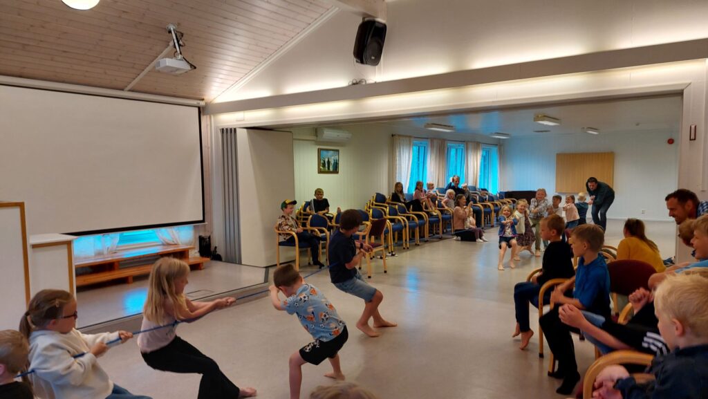 På lørdagen fikk vi en regnværsdag og en del av aktivitetene måtte tas innendørs. Den tradisjonelle spor-leiken ble gjennomført i gangene på Ekely, og i møtesalen ble det både leker, tautrekking og potetløp. Det engasjerte virkelig!